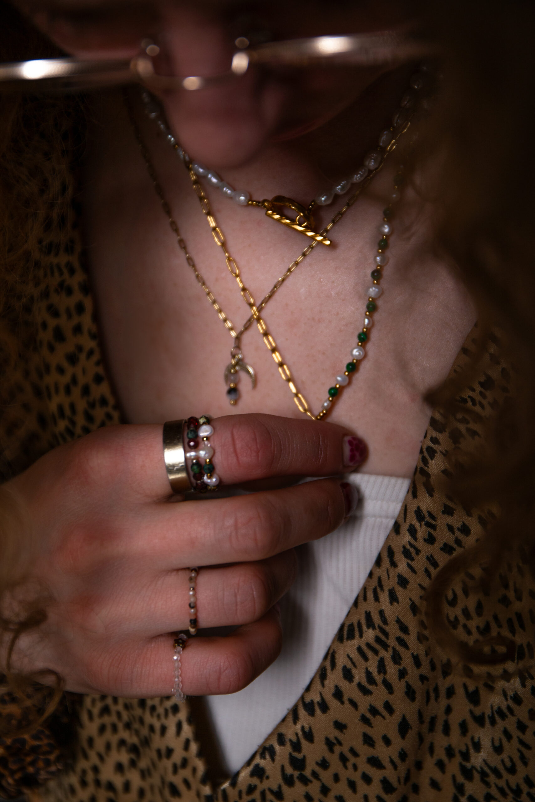 Kamienie naturalne, takie jak ametyst, granat czy różowy kwarc, są starannie wyselekcjonowane i wykorzystywane w projektowaniu biżuterii, dzięki czemu każdy kawałek ma piękny, naturalny wygląd 🌙